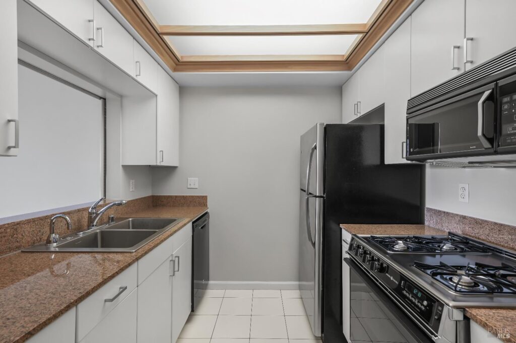 This top-floor, light-filled 1 bedroom, 1 bathroom condo is one of our finest. With 10-foot ceilings and expansive nature views, this luxury residence checks all the boxes. The spacious living room with fireplace opens easily to a balcony overlooking lush greenery and Silveira Ranch beyond. Functional features include an in-unit washer/dryer and abundant storage hall, patio, and cage closets, plus a walk-in closet in the bedroom suite.